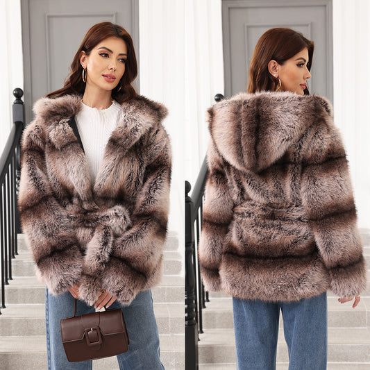 Damen Kuschelige Kunstpelzjacke mit Kapuze und Schleifendetails Merchesia