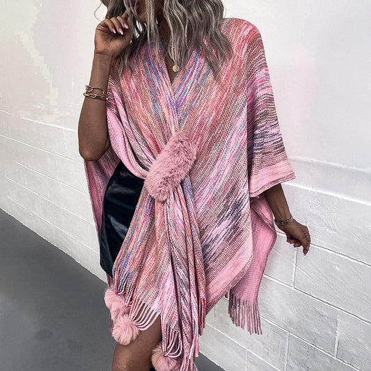 Damen modischer Poncho mit luxuriösem Kunstfellbesatz und kreativen Fransen Merchesia