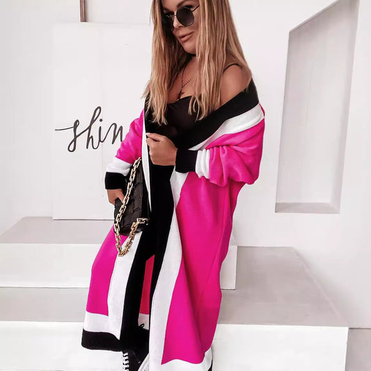 Damen modischer Langstrickmantel mit ausgefallenem Farbblockdesign und breitem Kragen Merchesia