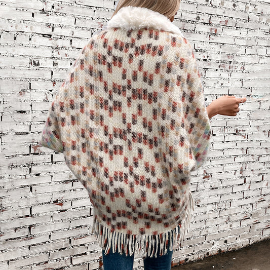 Damen eleganter Poncho mit luxuriösem Kunstfellkragen und Fransen Merchesia