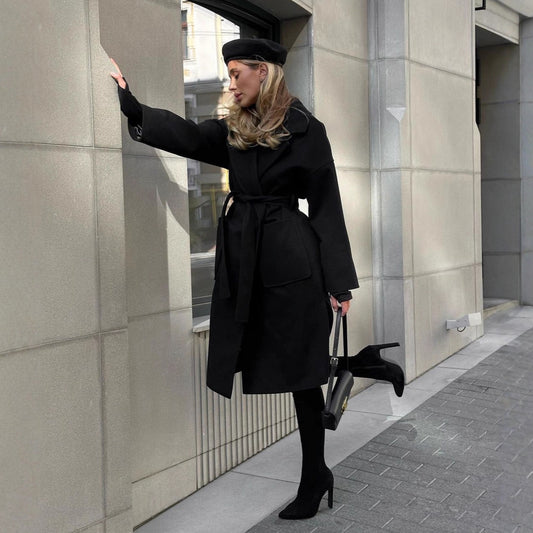 Damen Eleganter Übergangsmantel mit breitem Revers und Gürteldetail Merchesia