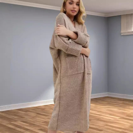 Damen Grobstrickmantel mit praktischen Taschen und elegantem V-Ausschnitt Merchesia