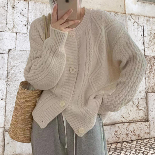 Damen kuschelige Strickjacke mit voluminösen Ärmeln und einzigartigem Zopfmuster Merchesia
