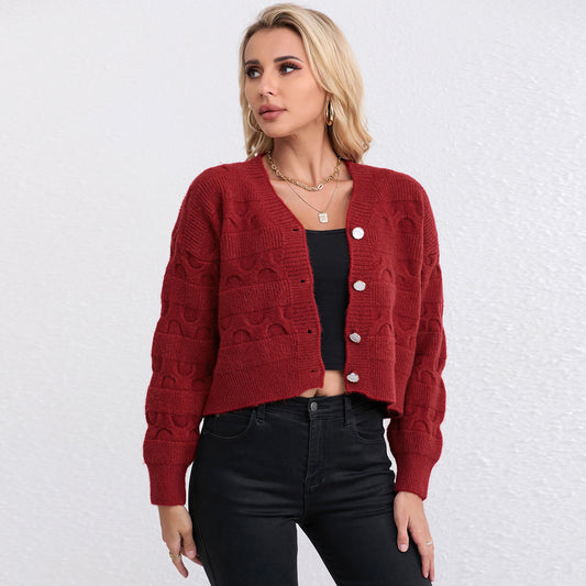 Damen Strickpullover mit tiefem V-Ausschnitt und großen Holzknöpfen Merchesia