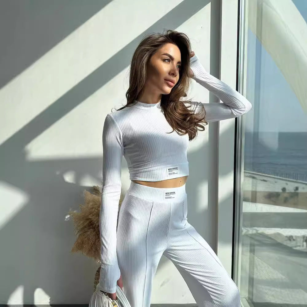 Entdecken Sie das perfekte Kombination aus Stil und Komfort mit unserem eleganten langärmeligen Oberteil und der passenden Hose im modernen Rippdesign. Dieses Set ist ideal für trendbewusste Damen, die Wert auf eine modische und zugleich bequeme Garderobe legen.