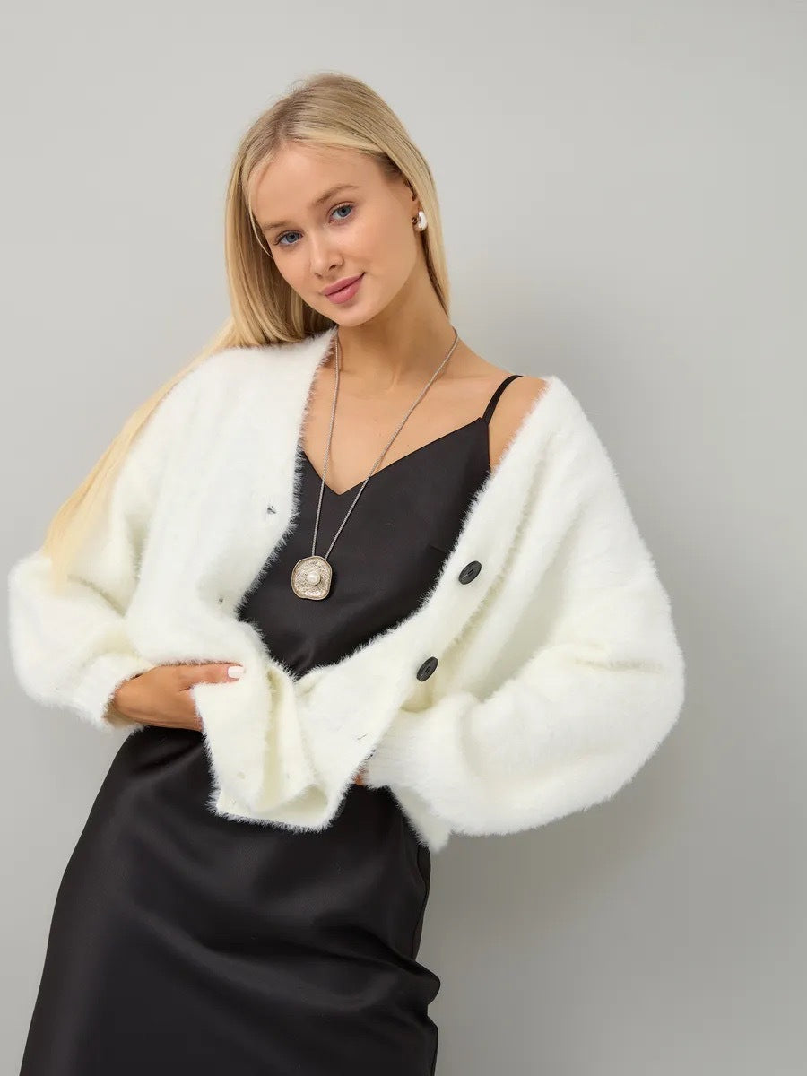Damen Flauschiger Cardigan mit tiefem V-Ausschnitt und Knopfdetails Merchesia