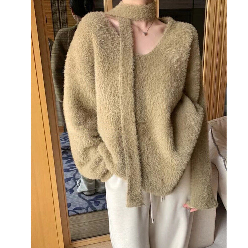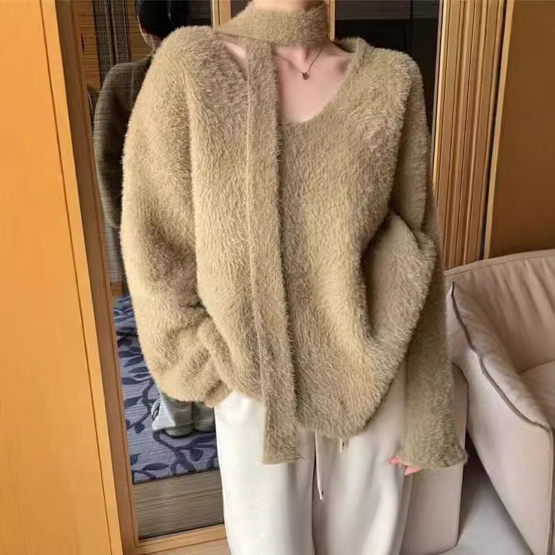 Damen Grobstrickpullover mit tiefem V-Ausschnitt und schicker Banddetails Merchesia