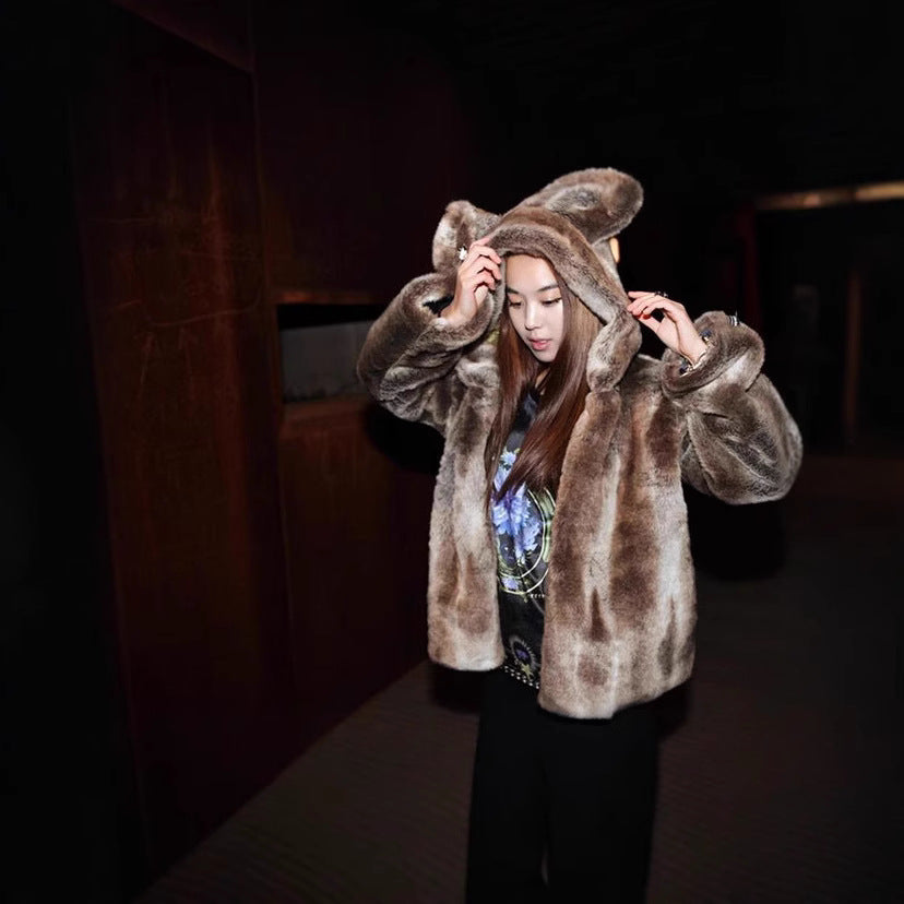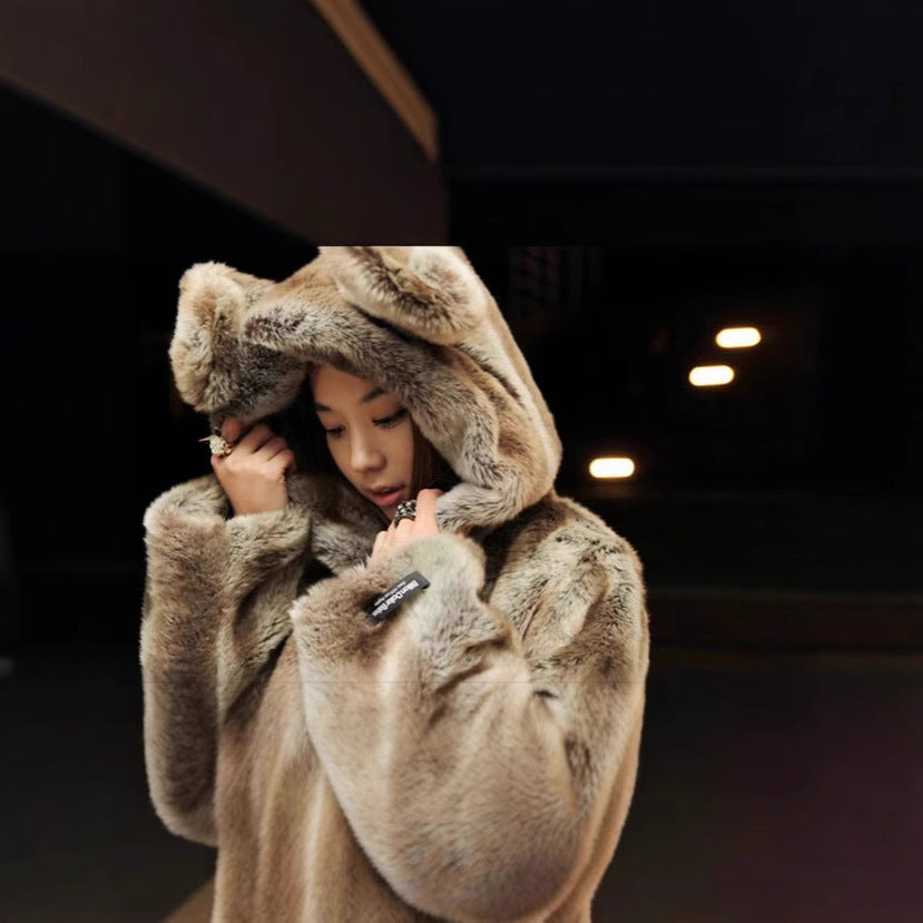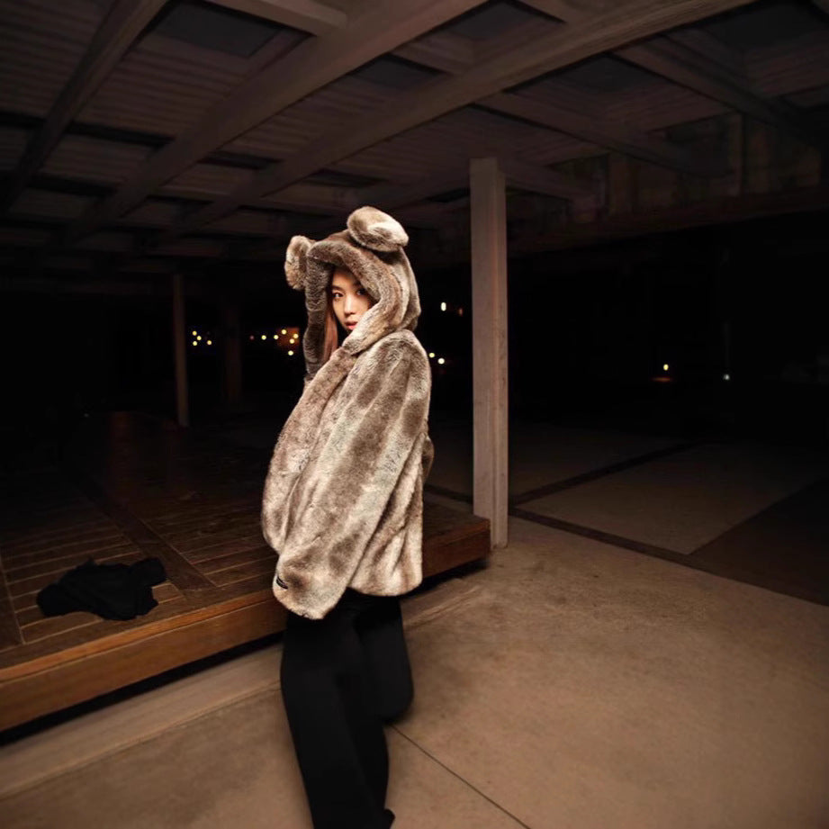 Damen Kuschelige Kunstpelzjacke mit verspieltem Ohren-Design Merchesia