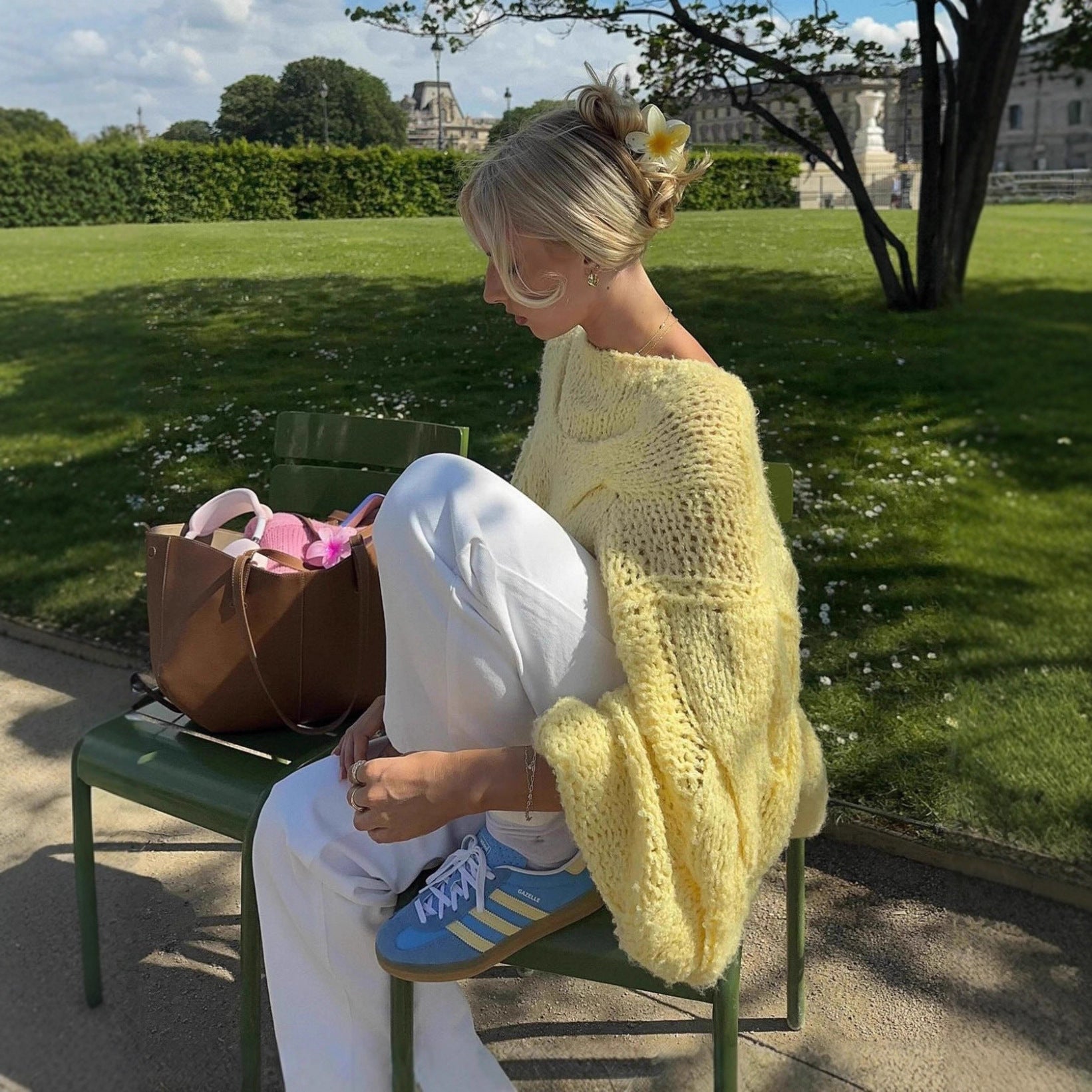- Design: Der lockere Schnitt und die weit ausgestellten Ärmel sorgen für eine großzügige Passform, während das grobe Strickmuster einen lässigen, aber eleganten Look kreiert.